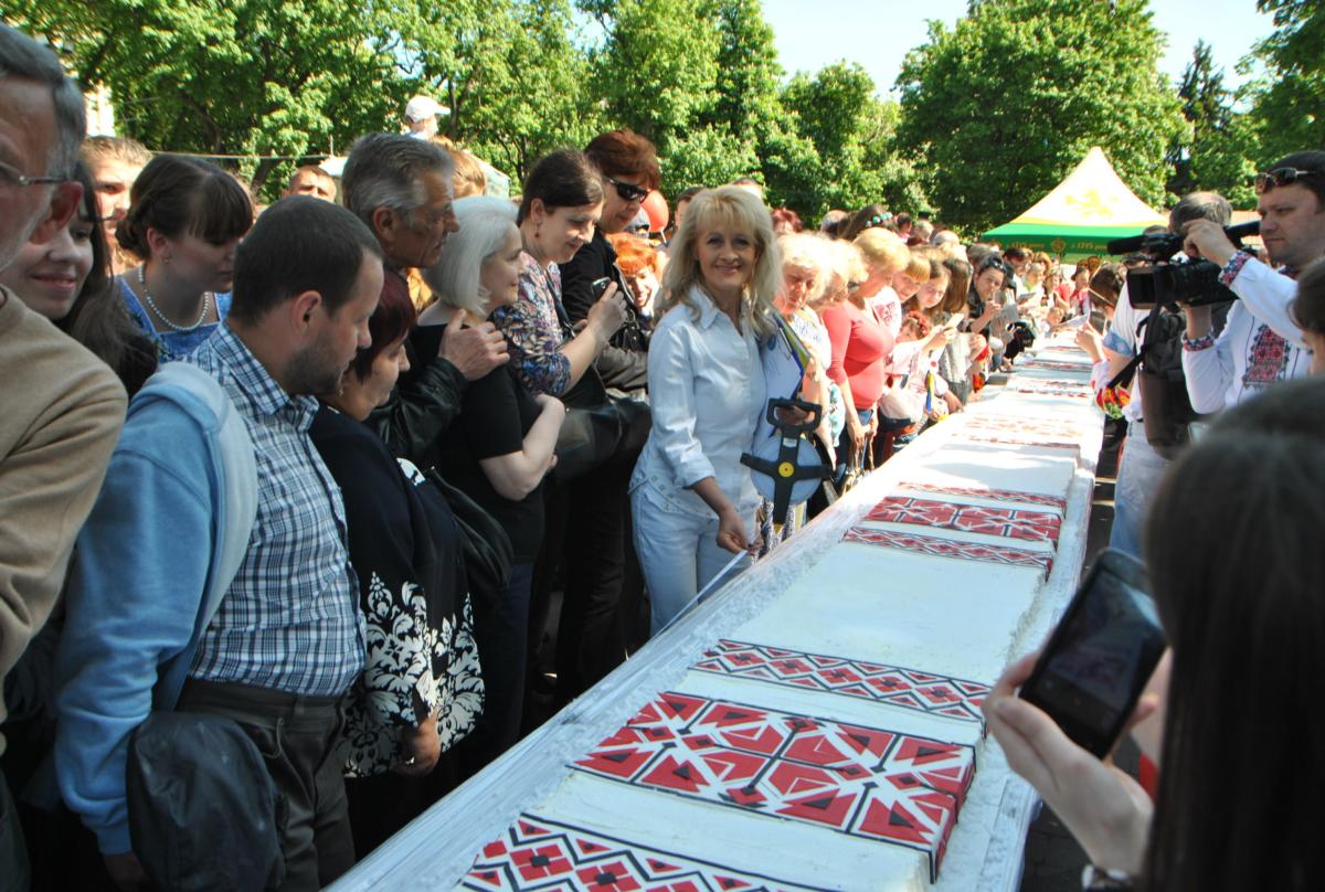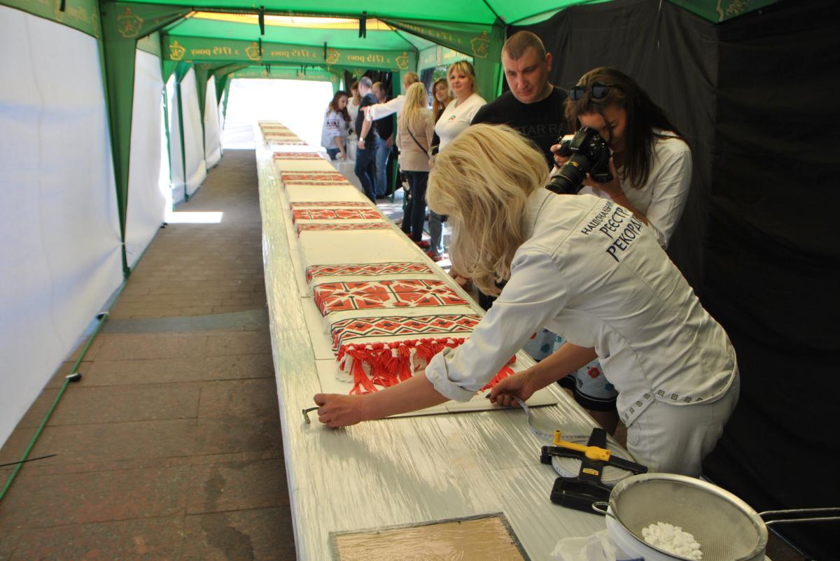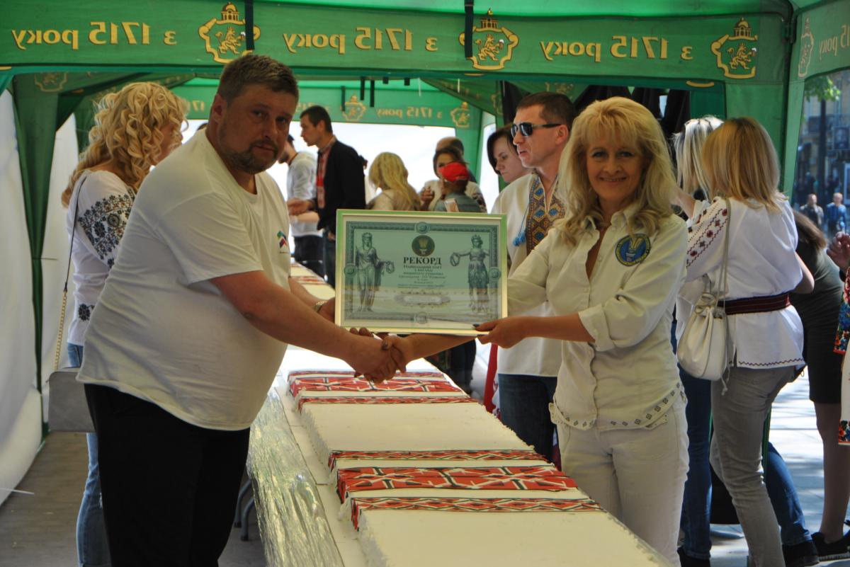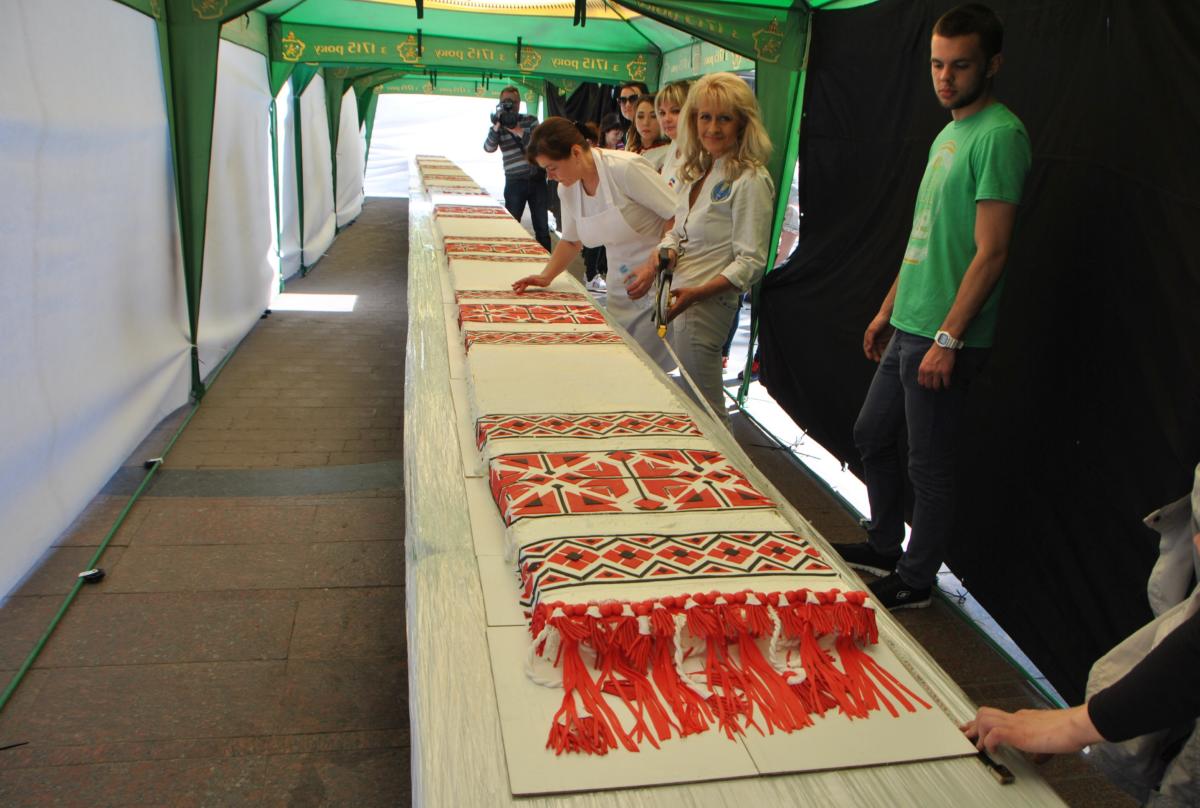 Варто лише поглянути на найдовший в країні торт, зроблений у вигляді вишитого українського рушника, щоб вразитись. Таким солодким рекордом привітали усіх українців з Днем вишиванки Львів та місцевий осередок громадського об’єднання «Розвиток громади». Знаменитий львівський пляцок розтягнувся в довжину на 16 метрів! З урахуванням його 60-сантиметрової ширини площа пляцка склала 9,6 м кв. Одним словом, було куди впасти обличчям, задивившись на це кондитерське чудо…