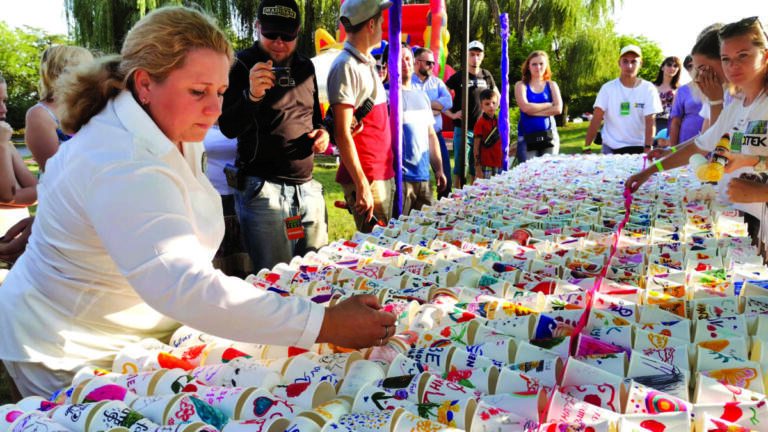 Панно, створене з найбільшої кількості стаканчиків, розмальованих у техніці скетчингу