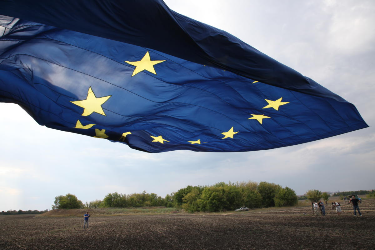 The largest EU flag which was lifted into air measures 24.04 x 35.5 m which equals 853.5 sq. m. in total. The feat commenced in Pokrovsk, Donbass region, during Europe Day, 2016. It was hoisted into the air by three giant kites.