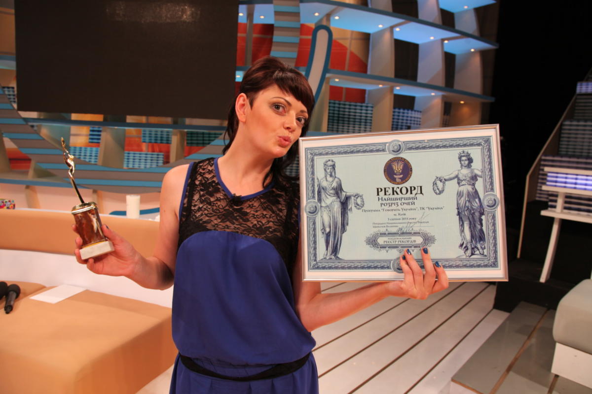 `The Eyes have it!` Two girls, both named Liliia, competed for the widest eye record which was televised by Ukraine TV Channel in a show hosted by Aleksei Sukhanov. The width of Liliia Vergeles` eye was 34 mm. The width of Liliia Lukashova`s eye from Dnipro turned out to be just 3 millimetres wider, by a hairbredth so to speak, but that was enough to set the new record.