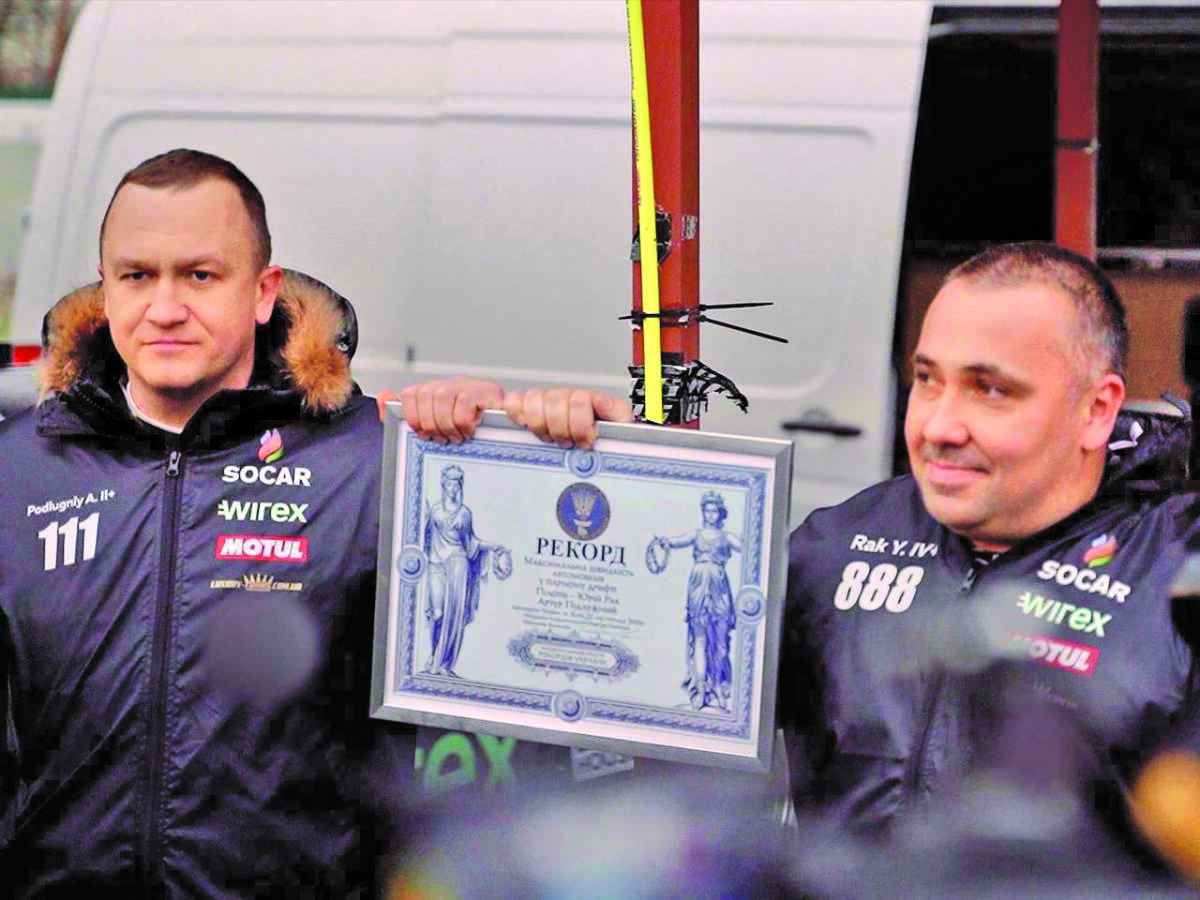 Професійні автогонщики Юрій Рак та Артур Підлужний установили рекорд у парному дрифті. Умовою рекорду був одномоментний керований занос обох авто на максимальній швидкості, після чого треба було змінити траєкторію руху на 180 градусів. Місцем випробування власних сил та майстерності гонщики обрали відомий серед дрифтерів київський автодром «Чайка». Рекорд міг не відбутися, оскільки в день рекорду почав накрапати дрібний дощ, а слизьке покриття вже навіть на швидкості 100 км стає смертельно небезпечним, але ризик — то шляхетна справа, гонщики кинули виклик погоді. У результаті зафіксовано керований занос на швидкості у 213 км/ год, що стало абсолютним рекордом для парного дрифту. Організатори — «Асоціація авто- і мотоспортсменів України» за підтримки компанії Socar, британської фінтехкомпанії Wirex, виробника моторних мастил Motul і міжнародного провайдера Coarea.