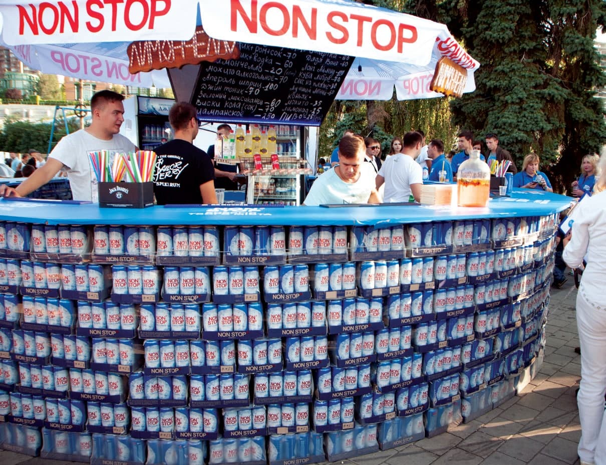 Під час святкування Дня міста в Дніпрі з енергетичних напоїв у металевих банках «NON STOP» (торгова марка ГК «Напої Плюс», генеральний директор — Ігор Бінецький) спорудили найбільшу в Україні барну стійку. Її довжина становила 15 метрів 77 сантиметрів, висота — 1 метр 22 сантиметри, ширина — 0,53 метра. Для цього знадобилось кілька годин фізичної праці non-stop і 9998 банок.
