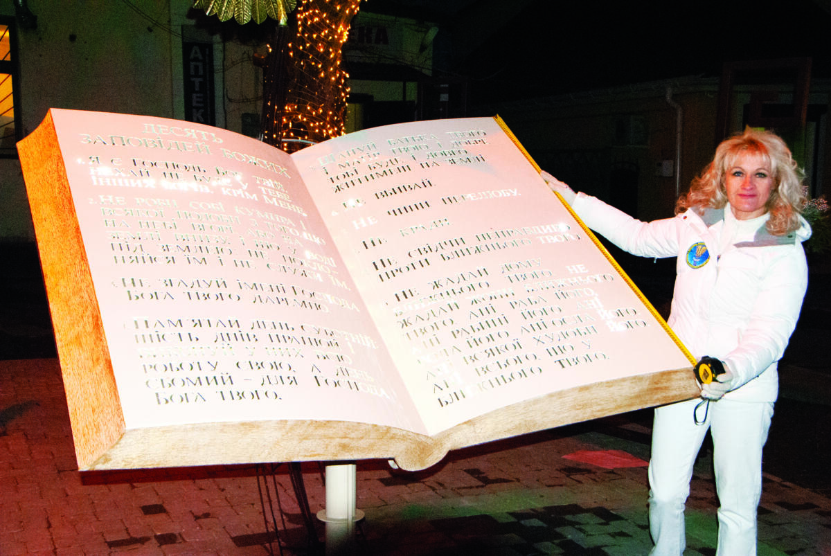 Таку книга заповідей не вдасться розмістити на своєму столі… Тут усе залежить від габаритів. Чималеньку інсталяцію виготовив у місті Доброслав майстер Освальдо Іскерго Фрага. Її точно біля ліжка не покладеш і перед сном не почитаєш, але це не проблема для мешканців Доброслава: вони знають 10 заповідей напам’ять. А якщо забувають — приходять до центру міста подивитися на розкішну арт-інсталяцію. Ширина книги в розгорнутому вигляді — 1 м 80 см, а довжина — 1 м 40 см. Вага (без підставки) — 85 кг.