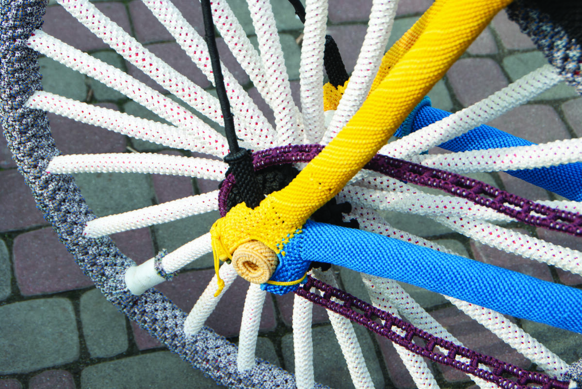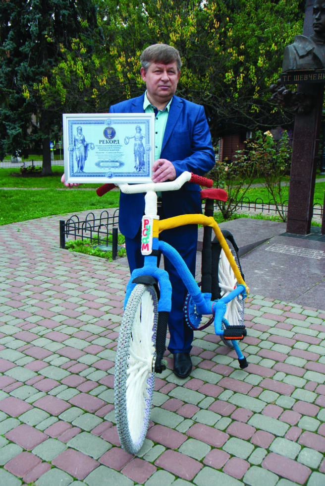 Майстер макраме Станiслав Рудич із Вишгорода на Київщині із 7 км ниток зв’язав… точну копiю велосипеда! Ми спочатку засумнiвалися, чи можливо це зробити без використання в основi металевого каркаса? Дивовижно, але так! Виріб досить пружний та міцний. Це — iнсталяцiя велосипеда в натуральну величину, аналогiв якої немає у світі. Висота — 1 м 17 см, довжина — 1 м 84 см. При цьому колеса крутяться, знiмаються, кермо повертається. Як і в справжньому велосипеді, педалями прокручується заднє колесо. Аж 5 років майстер в’язав 120 000 вузликів.