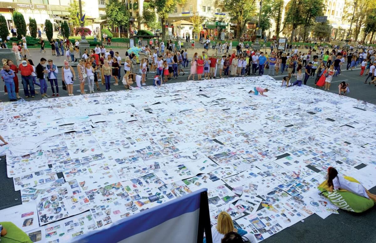 Такий колаж нереально розмістити на жодній зі стін, але можливо — на асфальті в центрі столиці. Загадати тисячу бажань за годину — легка справа для кількох сотень дружних сімей. Разом вони намріяли аж 252,9 квадратних метра! Спеціально до 27-ї річниці Дня Незалежності України. На величезній карті мрії, складенії з персональних і родинних колажів, — подорожі, власне житло, автомобілі, бізнес. Проте найбільшою мрією українців стало завершення війни на сході і мир на планеті. Організатор — компанія BogushTime.