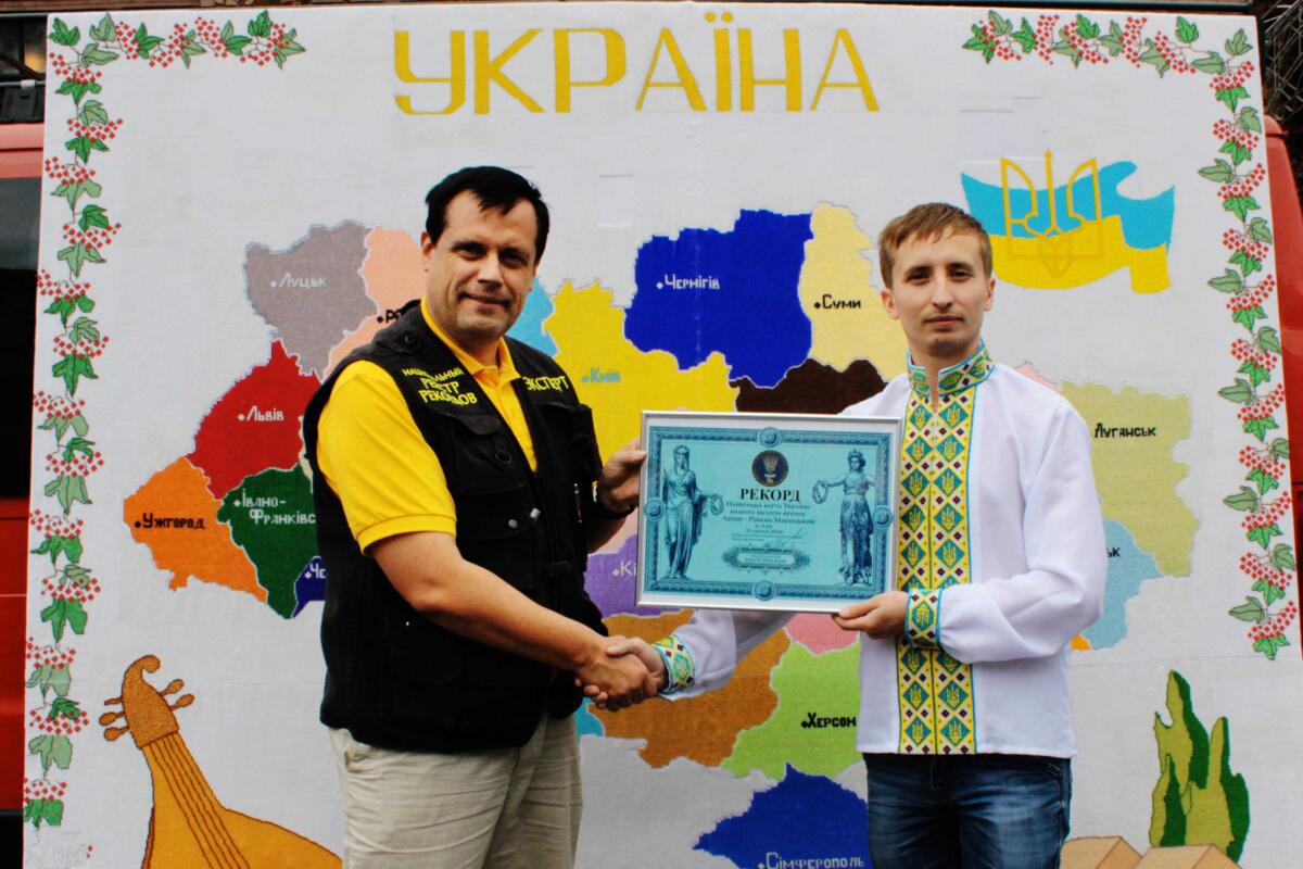 Унікальна робота 25-річного Романа Магоцького з міста Комарно, що на Львівщині, складається з 1 мільйона 300 тисяч бісеринок, 48-ми кольорів та 11000 метрів ниток! Роман Магоцький гаптував зернятками бісеру свій шедевр щодня по 16, а іноді навіть по 20 годин впродовж року! Мапа України, вишита бісером, презентувалася в Києві на День незалежності.