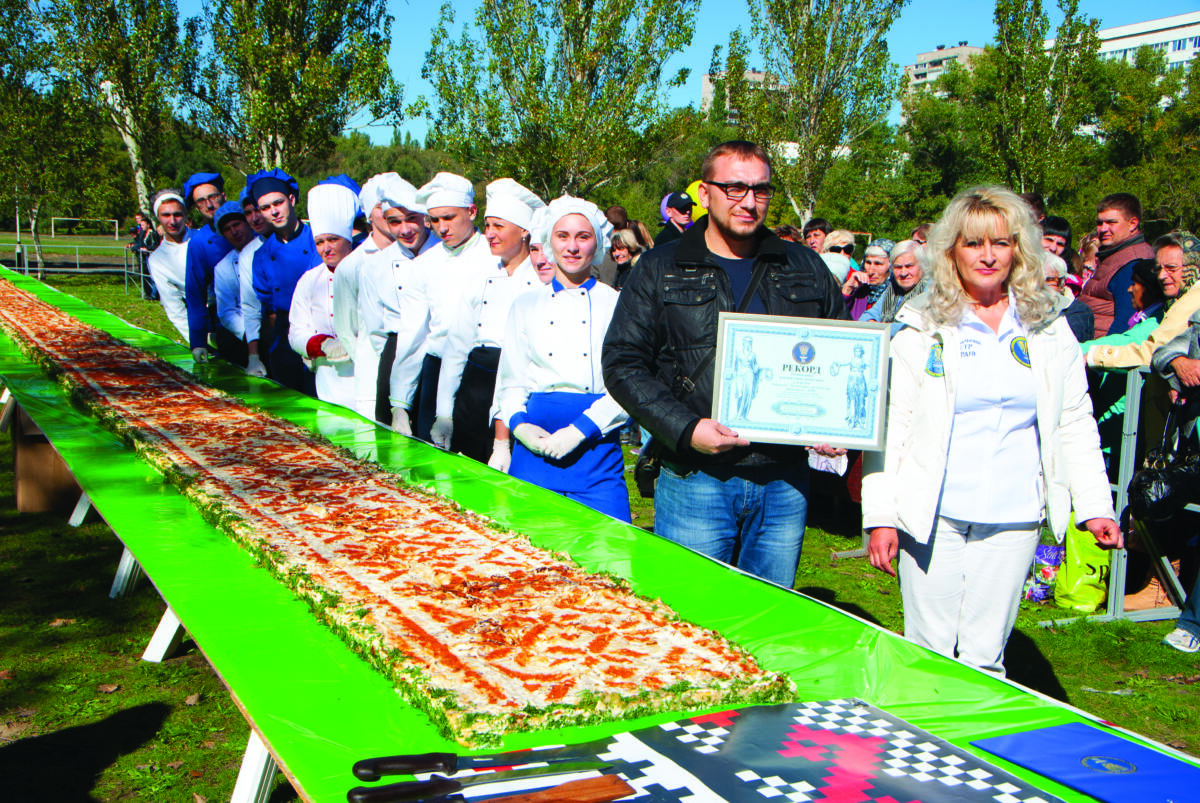 Справжній козацький рід! Адже понад чотири тисячі порцій за пів години будь-хто не подужає. У День міста Запоріжжя кулінари влаштували рекордне частування. Картопляно-м’ясну запіканку на 15 квадратних метрів 96 сантиметрів готували впродовж двох днів. Використали 850 кілограмів картоплі, 380 кілограмів курки на кістці, 80 кілограмів майонезу, зелень, паприку і багато старання. Довжина гастрономічного творіння — 260 см, ширина — 60 см, а висота — 6 см. Це найбільша картопляна запіканка з м’ясом в Україні. Організатор — Запорізька міська рада за підтримки Асоціїації рестораторів та готельєрів м. Дніпро.