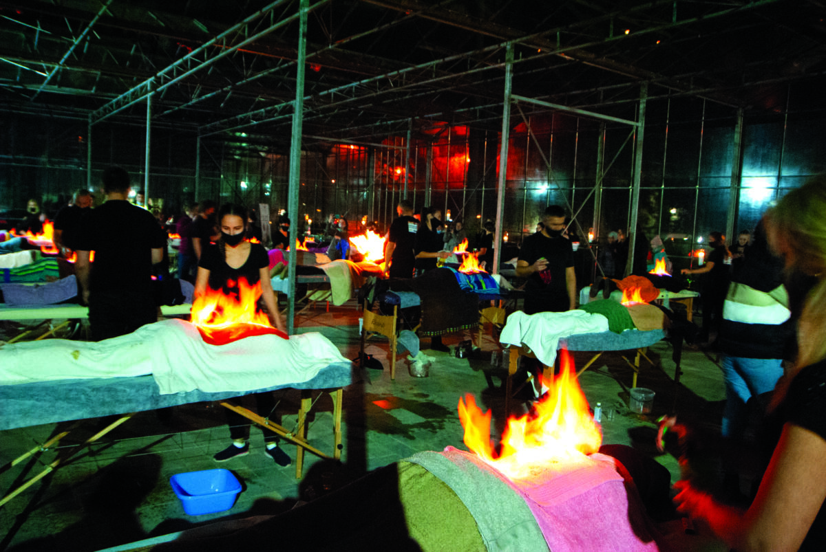 У Тернопіль, як метелики на вогонь, злетілися найкращі масажисти. І кожен з них, немов якийсь таємничий обряд, під час масажу використовував то вогонь, то крижану воду. Вогнетерапія — унікальний вид оздоровлення людини, якщо правильно її застосовувати. І такий коктейль адреналіну, виявляється, корисний для організму! Не даремно він названий «Королівський вогняний масаж». До того ж це цілком безпечно — можна навіть рекорди встановлювати! Організатор — Тернопільський національний медичний університет імені І. Горбачевського, кафедра фізичної терапії, ерготерапії та фізичного виховання (зав.кафедри д.м.н, проф. Попович Д. В.). Координатор рекорду — Оксана Петришин.