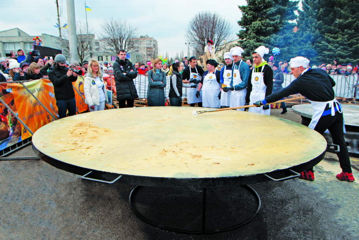 Всього одним млинцем нагодувати всіх гостей свята Масляної у місті Дружківка Донецької області. Там спекли найбільший млинець у країні. Діаметр сонячної страви має 3 метри. Замішували всі інгредієнти та запікали мегамлинець десять кухарів. При випічці його не перевертали, а підсмажували вогнем зверху. Вийшов з рум’янцем і апетитний. Організатор рекорду — БФ «Фонд Бориса Колеснікова».