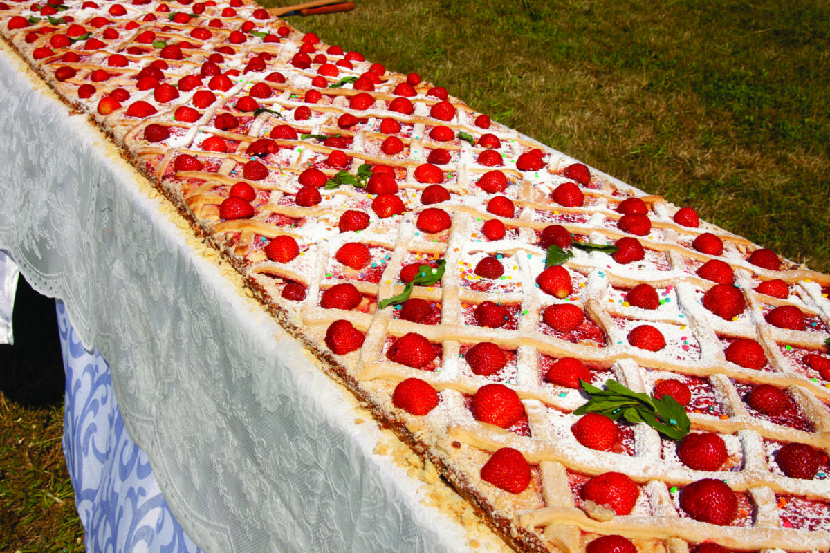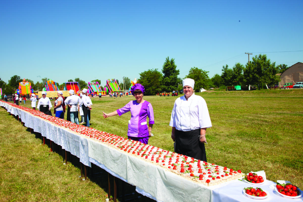 Тільки уявіть нескінченний полуничний пиріг! Таке враження може скластися, коли йти вздовж столу з пирогом завдовжки 43 метри 97 сантиметрів! До всього цей смаколик має ширину 52 см, а у висоту — 2,7 см. Точніше — мав. Бо гості щорічного традиційного фестивалю на Сумщині мусили переконатися ще й у смакових якостях пирога. Вердикт — дивовижно смачний! Полуничне свято вже є брендом краю, а от диво-пиріг — візитівка села Малий Самбір. Організатор — Конотопська РДА.