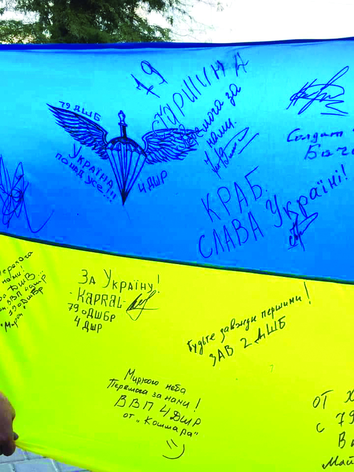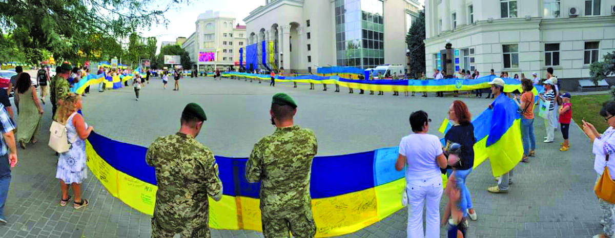 У Херсоні військові та волонтери з’єднали разом прапори, які привезли в різний час із зони бойових дій. 112 прострілених, вигорівших під сонцем та пошарпаних вітром, підписаних автографами бійців прапорів України… Декого з них уже немає серед нас… Цей спільний прапор завдовжки 152,4 метра об’єднав Україну в прагненні до миру. Цю ініціативу Херсон передав іншим містам. Організатор — Херсонська обласна державна адміністрація, голова — Юрій Гусєв.