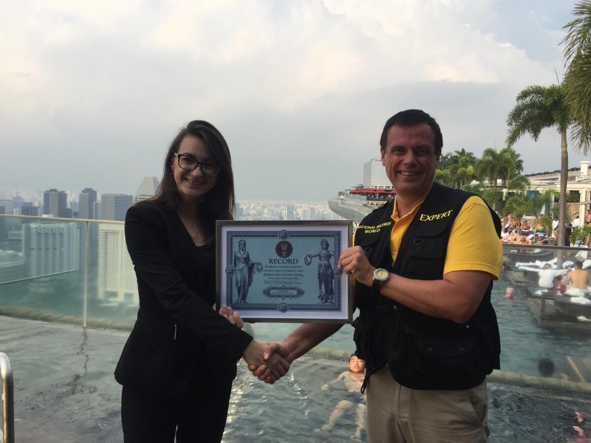 Найдовший у світі басейн без бортика, 142 метри завширшки, розташований у готельному комплексі Marina Bay Sands у Сінгапурі. Одна його сторона візуально зливається з небом і переходить у нескінченність, чим і захоплює купальників. Плавець почувається вільним птахом, що кружляє у небесах над гігантськими хмарочосами!