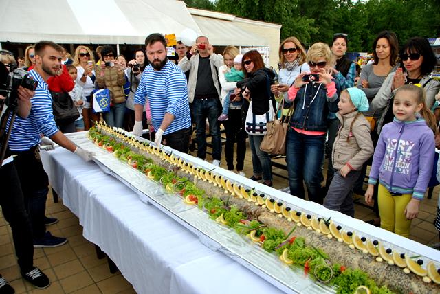 Персонажа цього одеського анекдоту зрозуміє кожен, хто відвідав «Таки-да фест» – фестиваль днів Одеси в Києві. Саме там відомий ресторатор Микола Тищенко презентував найдовшу в Україні фаршировану рибу. Страву, приготовану за класичним національним єврейським рецептом, було прикрашено як годиться – помаранчами, лимонами, помідорами, цибулькою, оливками та салатним листям. 4,14 м неймовірної смакоти так розпалили своїм виглядом уяву зголоднілої публіки, що коли справа дійшла до куштування рекорду, ніхто дійсно не звертав уваги, ложкою він їсть чи виделкою. Таки да!