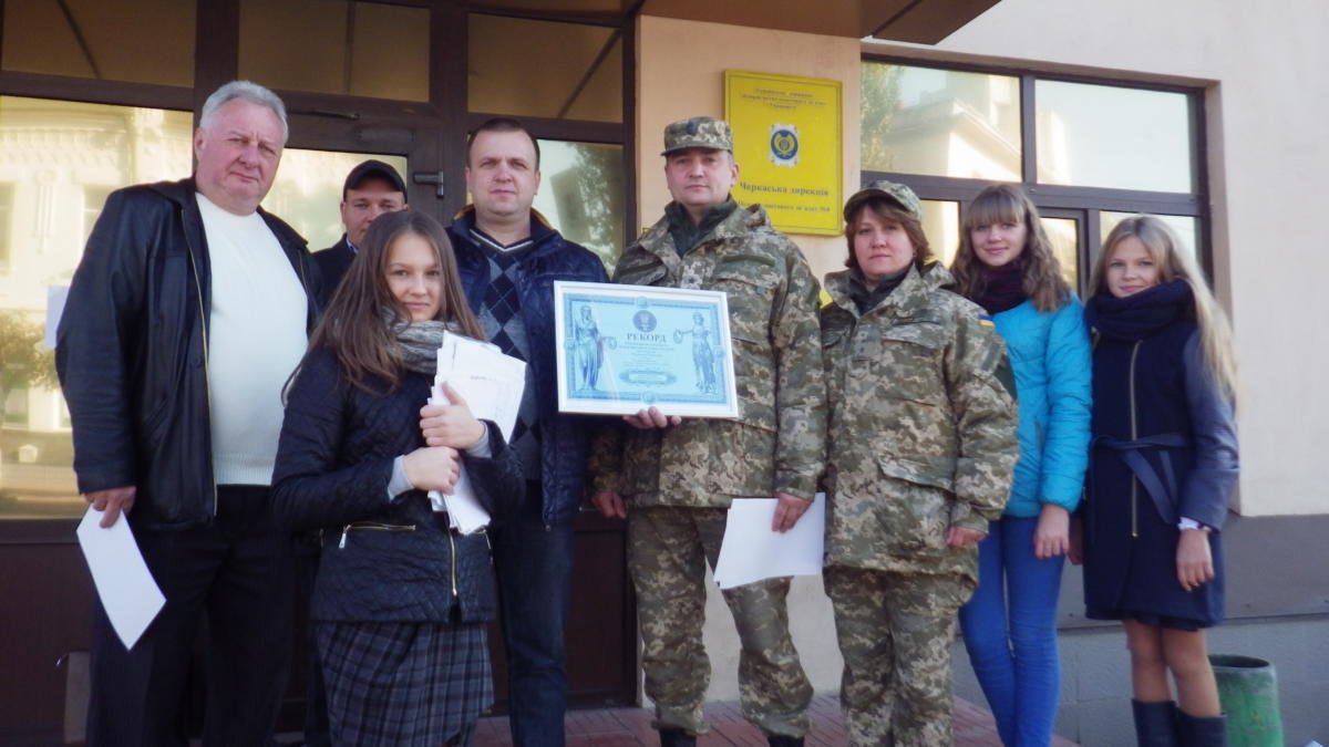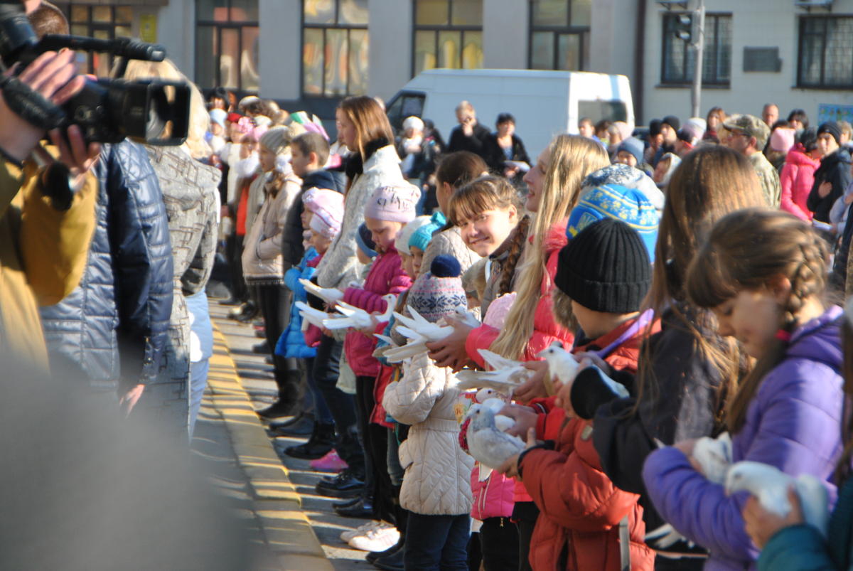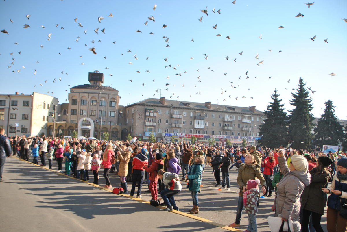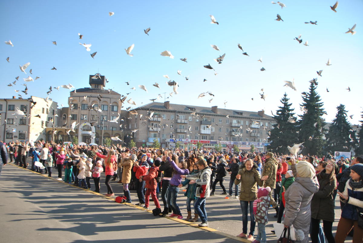 День захисника України відзначили в Умані символічною мирною акцією – кількасот дітей запустили в повітря білих голубів. Організував це дійство підприємець Володимир Панчук за сприяння в.о. міського голови Олександра Цебрія. Усі птахи мали злетіти одночасно. А діти є діти – хтось не втримав свого голуба до запуску, інші, навпаки, побоюючись випустити дочасно, так сильно притискали птахів, що нещасним створінням й злетіти вже було важко. Втім, зрештою все пройшло чудово, і 399 голубів синхронно шугнули в уманське небо, встановивши ще один рекорд України.