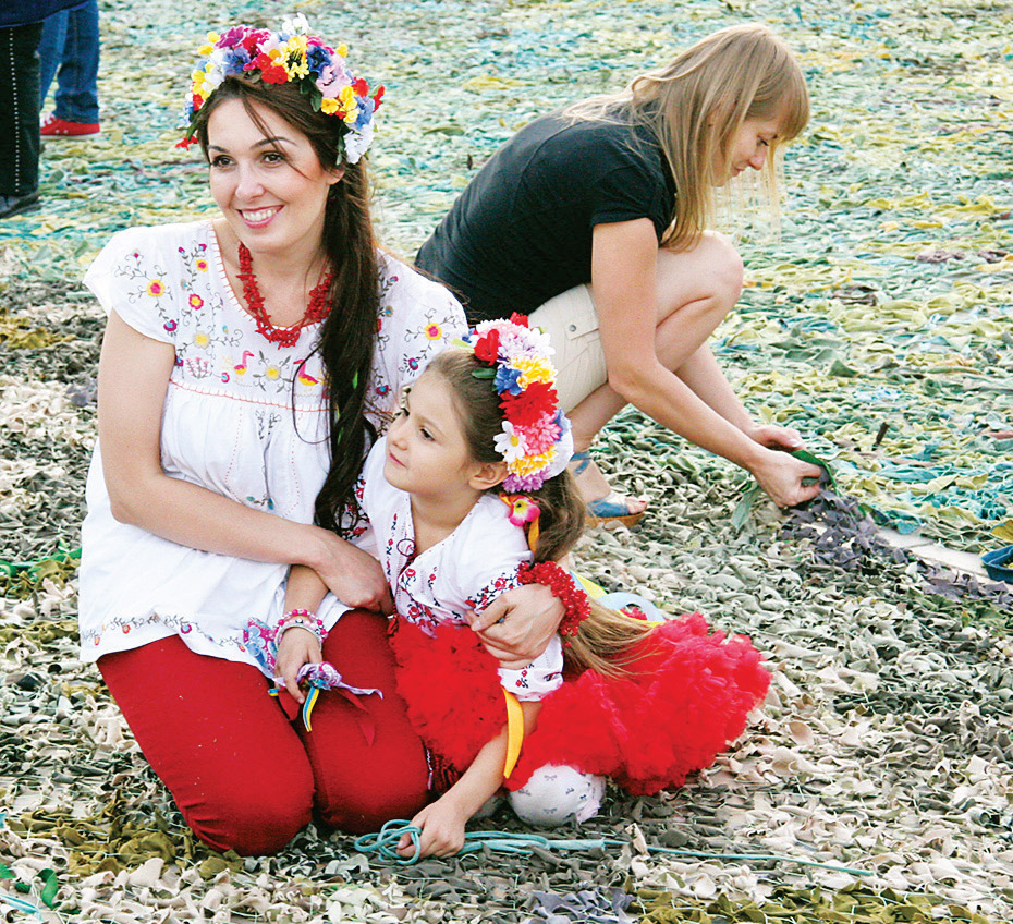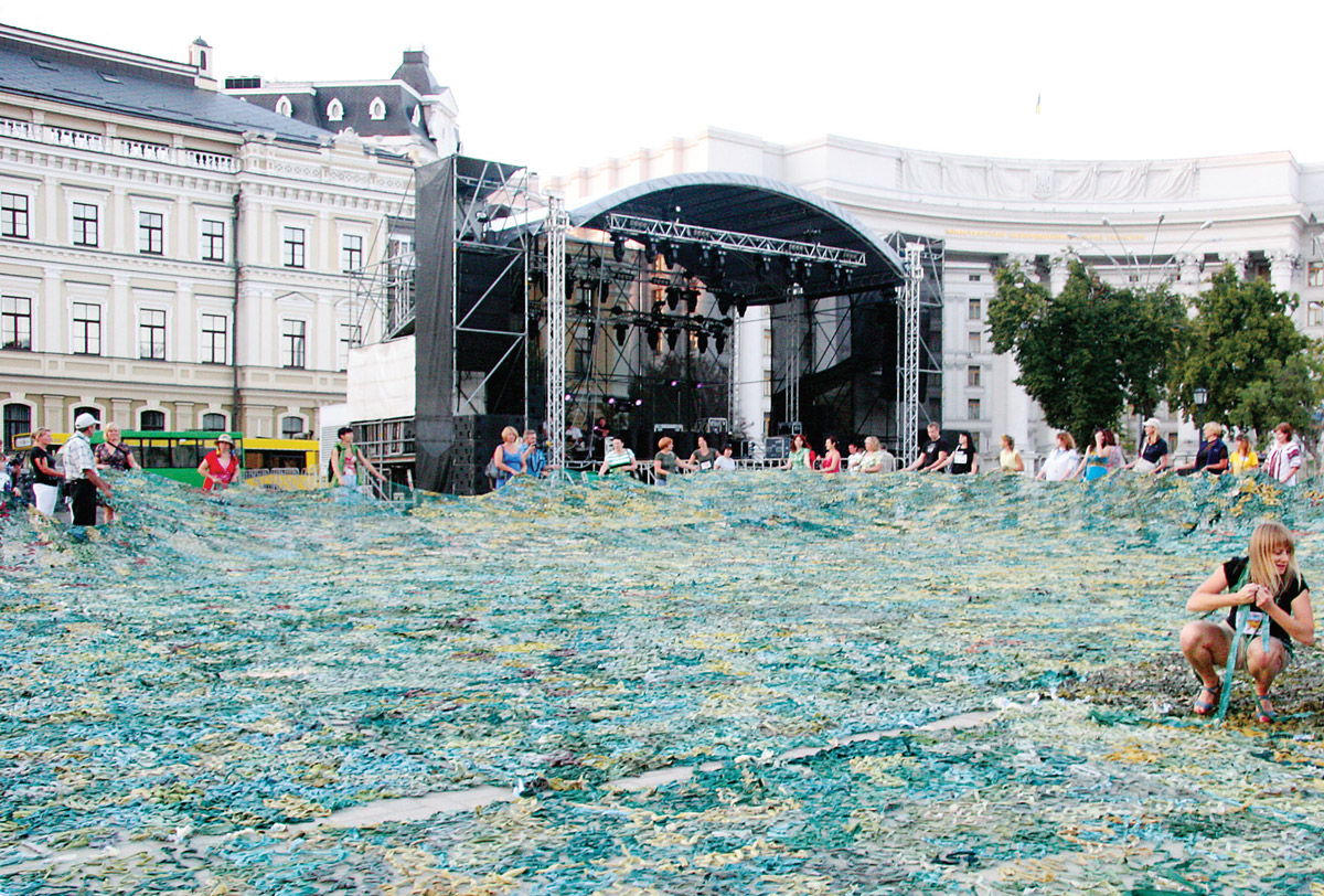 Яку це рибу збираються ловити на Михайлівській площі?» – дивувалися кияни та гості міста, побачивши розставлені на майдані великі риболовецькі сітки. Підійшовши ближче, цікаві одразу серйознішали – адже на площі волонтери плели більш актуальні в наш час сітки – маскувальні, для потреб української армії. Майже кожен вважає за честь приєднатися до толоки і вплести до основи бодай десяток камуфляжних стрічок. Тож немає нічого дивного, що акція, яку організували волонтерки Олеся Корягіна та Олена Бєлова, завершилася національним рекордом. 480 кв. м готової сітки негайно відправилися за призначенням у зону АТО.