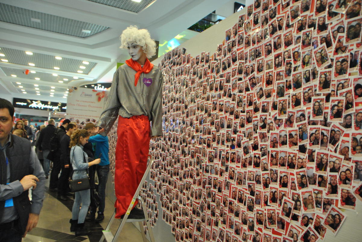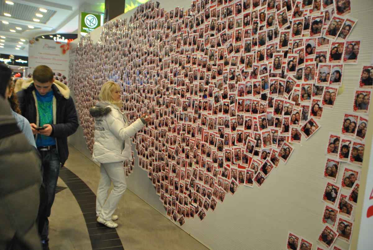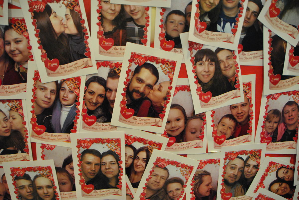 Науково доведений факт – закохані люди здатні на неймовірні романтичні вчинки. Хтось дістає для своєї половинки зірку з неба, хтось кладе до ніг цілий світ. А от харківські закохані узяли та й зібрали зі своїх миттєвих фото найбільшу в Україні «святкову» валентинку. У день всіх закоханих 2174 романтично налаштовані пари харків’ян (хлопець+дівчина) зробили 4348 миттєвих знімків у спеціальній фото-кабінці та наліпили їх на спеціально встановлену кількаметрову конструкцію у вигляді двох поєднаних сердець. Сфотографувавшись, пара залишала один знімок собі на пам’ять, а другий власноруч кріпила на стенд – у «сердечний» контур. Організатори дійства – торгівельно-розважальний центр «Французький бульвар» – відтепер можуть похвалитися найбільшим любовним іконостасом в Україні, зробленим закоханими. І, здається, найбільшою концентрацією любовної енергії в торгівельних приміщеннях.