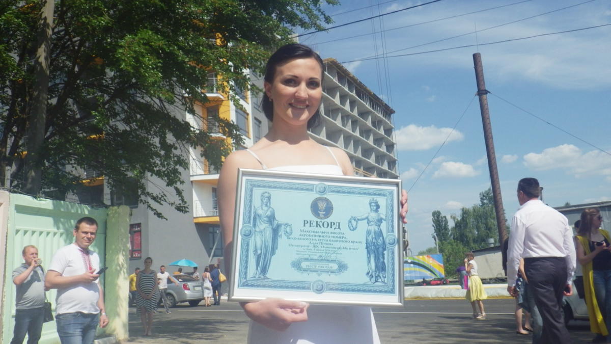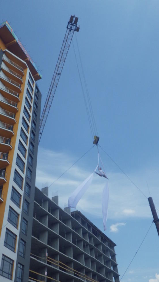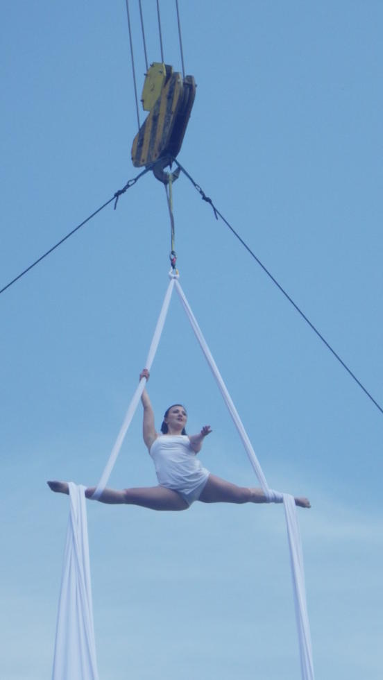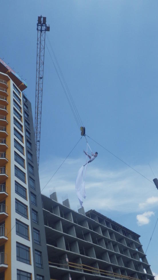 Здавалося б, будівельний майданчик – найменш підходяще місце для циркового шоу. Однак не тоді, коли його обирають для своїх виступів повелителі ризику та лицарі висоти – повітряні гімнасти. Так, влітку 2016 року на території будівельного майданчика (Олімпійське містечко) в Голосіївському районі Києва гімнастка Алла Попова виконала акробатичний номер на повітряних полотнах, які були закріплені на стрілі баштового крану. Під час її виступу у глядачів холонуло серце та перехоплювало подих – складну трюкову композицію дівчина виконувала на висоті 25 метрів без будь-якої страховки! За свою неймовірну «безбашеність» Алла і отримала звання рекордсменки України. Адже ніхто з її колег ще не ризикнув освоїти крюк баштового крану у якості циркового снаряда. А от ця тендітна дівчина змогла. Хоча і визнає, що дуже хвилювалася. Акробатика на полотнах – її коронний номер.