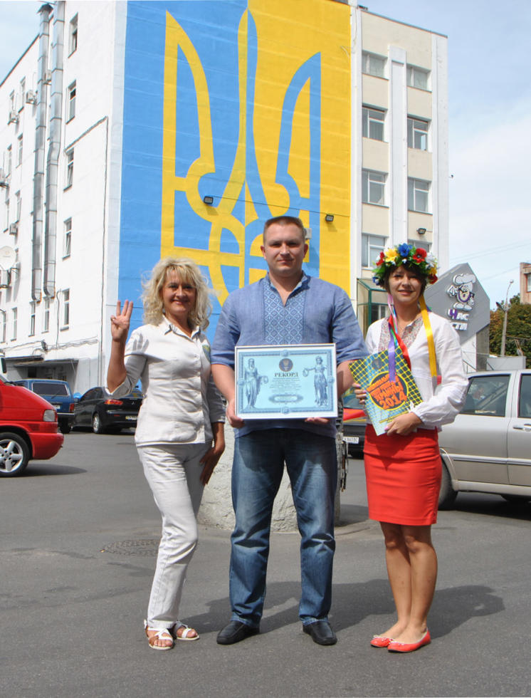 Як зафіксував експерт НРР, ширина зображення склала 12,5 метра, висота – 18 метрів. Організатор проекту – ТРЦ «Любава» (директор Олександр Чорний) дав проекту назву, яка минулоріч стала в Україні традиційною – «Єдина країна» – але від того аж ніяк не банальною, оскільки вона у тисячах повторень якнайкраще підкреслює ідею єднання нації в тяжкі часи. На фасадах десятків чи навіть сотень будинків в Україні з’явилися зображення національних прапора й герба, але жоден з них за розмірами не сягнув витвору черкаських художників.