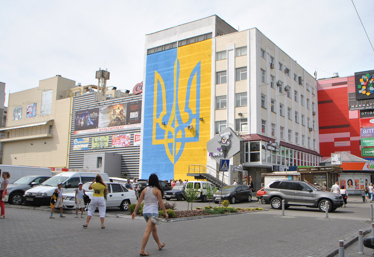 Молоді дизайнери, студенти Черкаського національного університету імені Б. Хмельницького Олександр Яковенко і Тарас Дядик самостійно розробили дизайн патріотичної прикраси для міста, а також ідею її нанесення на стіну. Завдяки сучасній ультимедійній апаратурі вони зобразили відбиток герба України на тлі кольорів державного прапора в центрі Черкас на фасаді торгово-розважального центру «Любава».