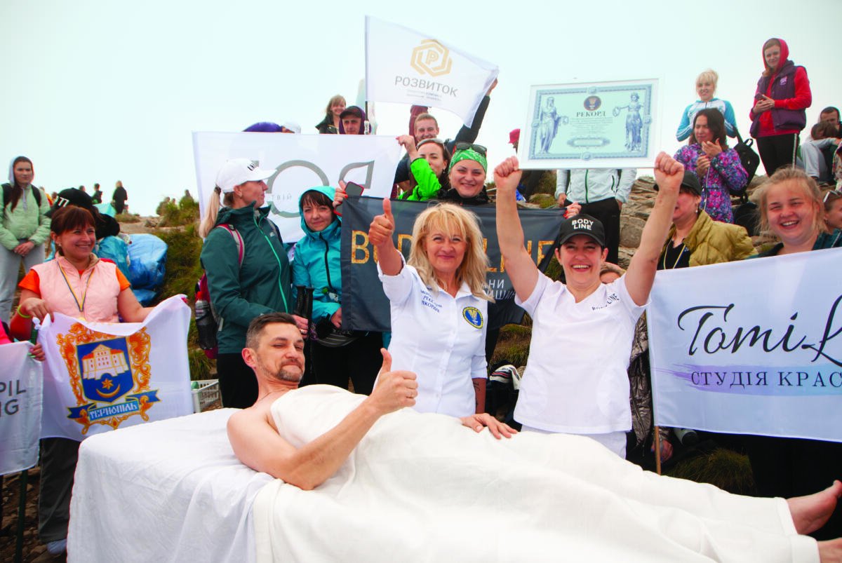 На висоті 2061 м Оксана Петришин, топ-масажистка із Тернополя, влаштувала імпровізований масажний кабінет, призначила персону оздоровлення й майже годину робила професійний масаж на вершині Говерли. Профілактично-лікувальний масаж, виконаний майстром на найвищій вершині України, — саме такий рекорд зафіксувала наша найстійкіша експертка Лана Вєтрова. Організатор рекорду — студія BODY LINE (м. Тернопіль).