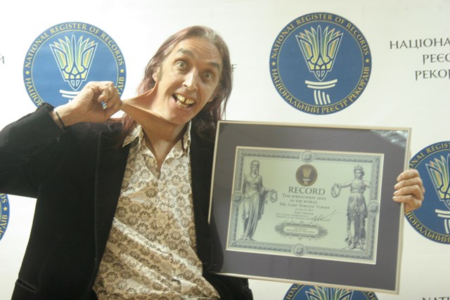Очевидно, что обладатель этого уникального дара 41-летний британец Гари «Стретч» Тернер — единственный человек на планете, который может натянуть задницу на глаз. Гари с легкостью покрывает кожей своего живота стол, или оттягивает кожу рук чуть ли не до пояса на 15,8 сантиметрова. На ток-шоу «Говорит Украина» гость продемонстрировал свои способности: растягивать его мог каждый желающий, чтобы удостовериться, что это не мошенничество.
