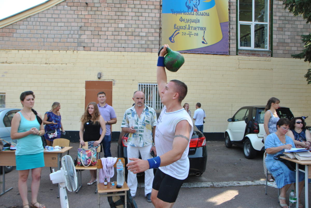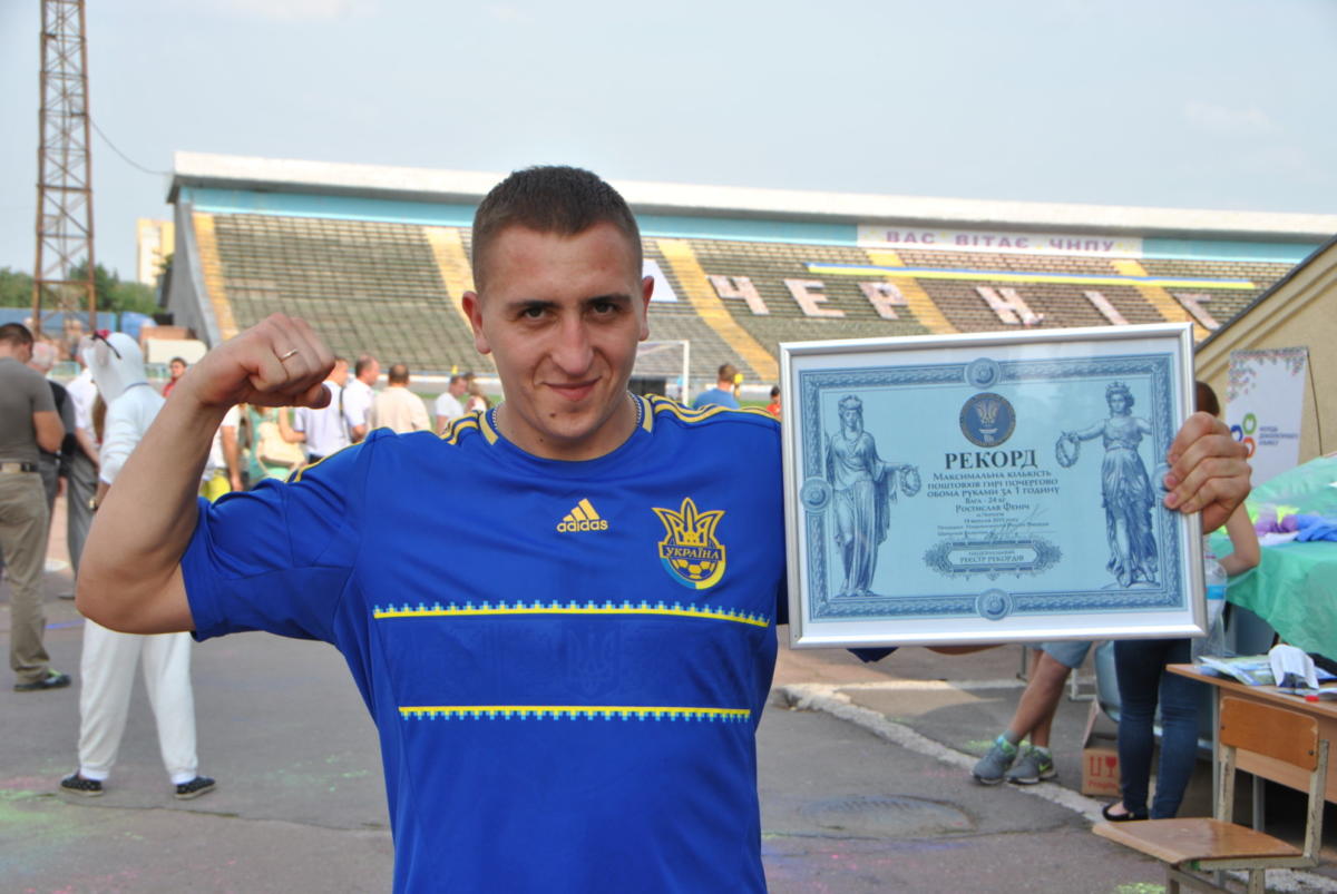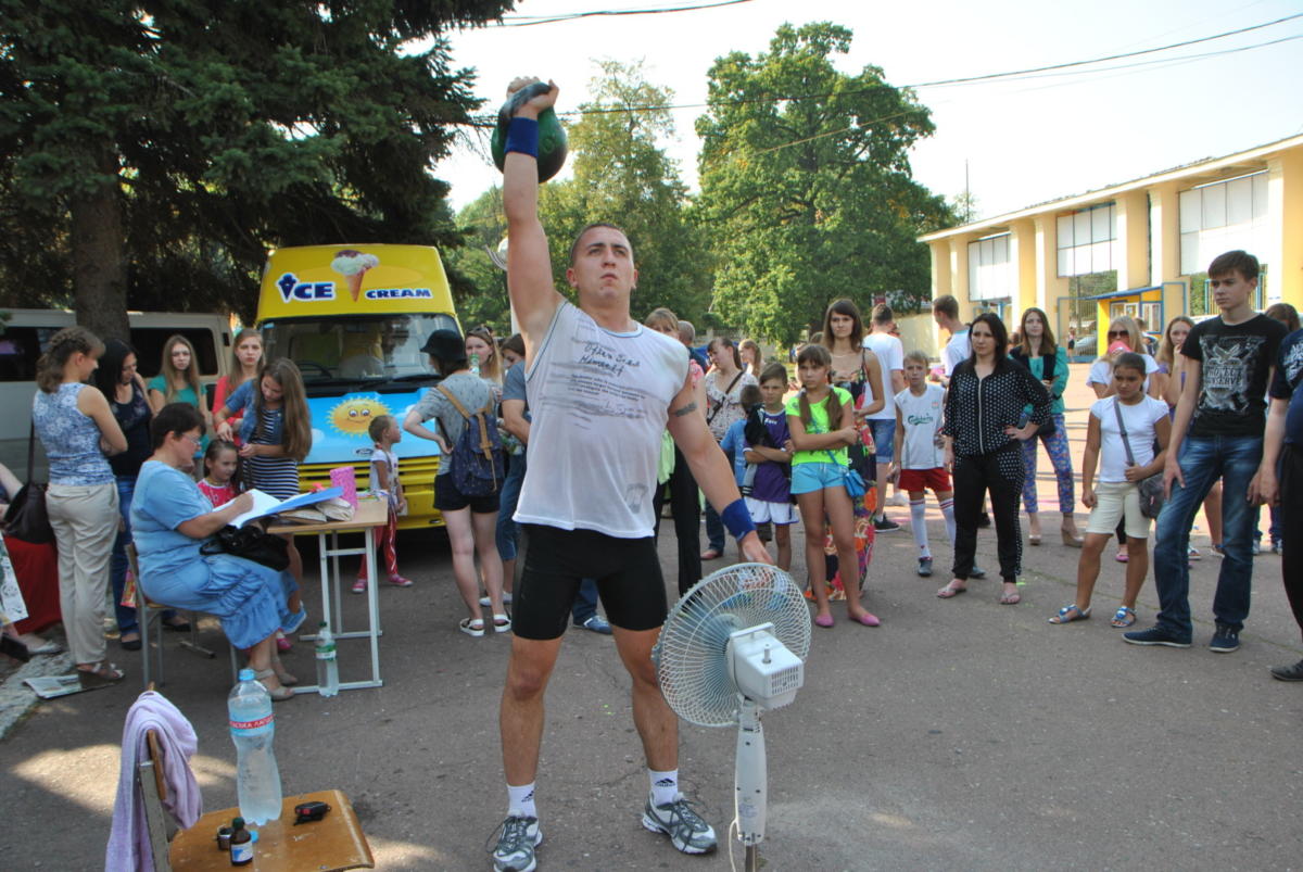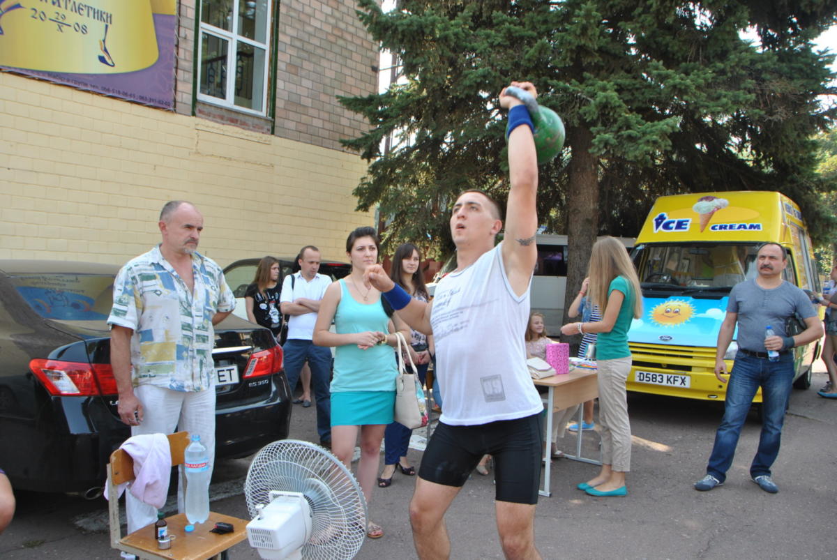 Когда военнослужащий из Чернигова, офицер Вооруженных Сил Украины капитан Ростислав Фенич решительно подошел к гире, казалось, что он сейчас попросит тазик, чтобы ее туда «выжать». Но портить полуторапудовый снаряд Ростислав не стал, и в течение следующего часа поднял его над головой 909 раза, ни разу не поставив на пол.