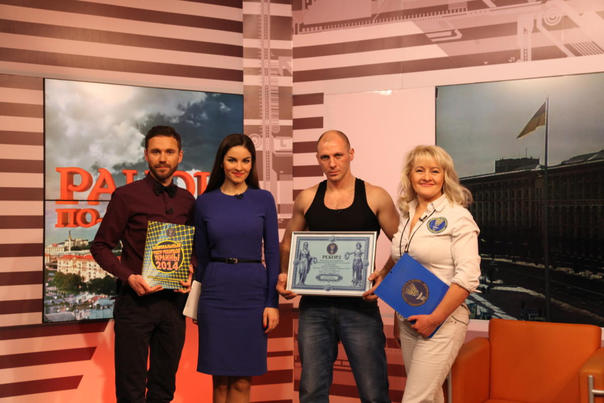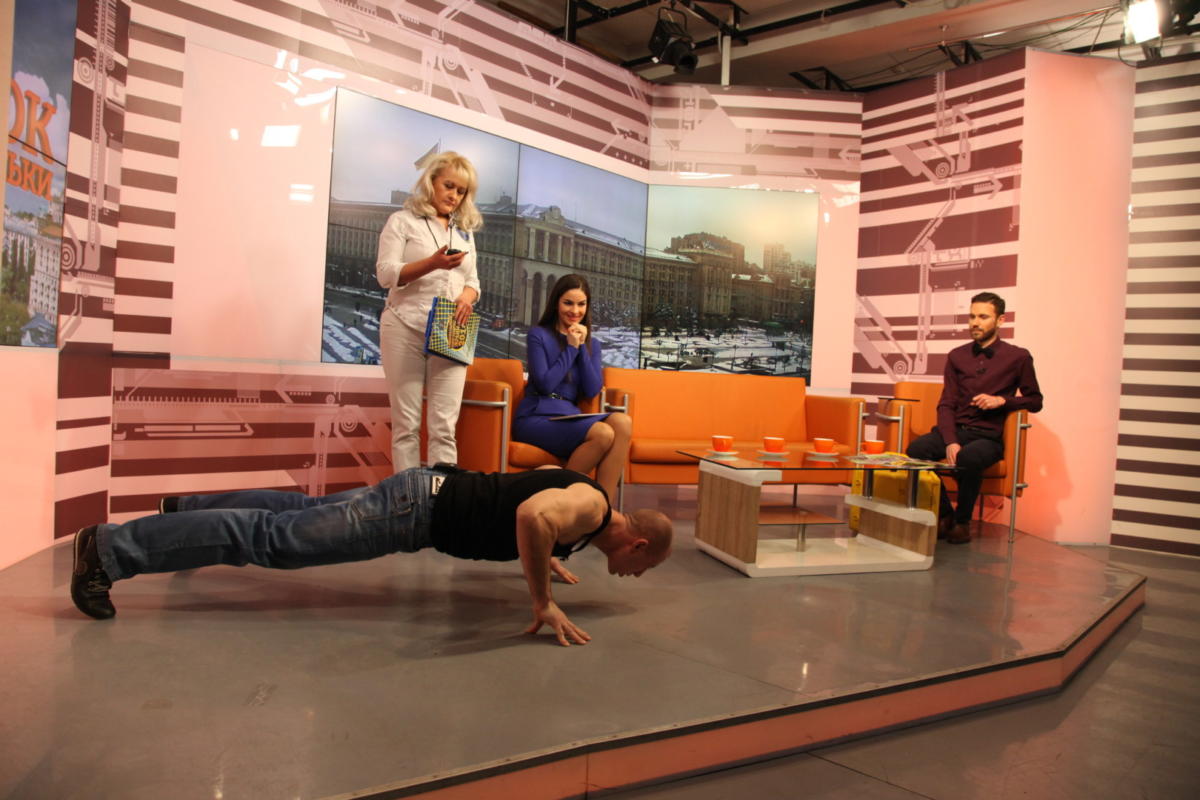 Вот, например, на прекрасном ровном полу студии телеканала «Київ», во время программы «Ранок по-київськи», продемонстрировал свой рекорд по отжиманию на кончиках пальцев киевлянин Аркадий Панферов.