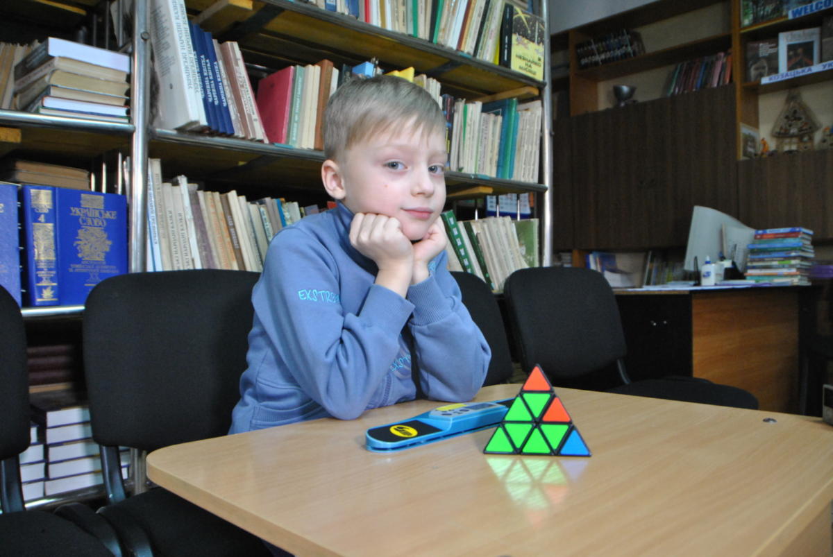 Головоломку Мефферт (она же «Молдавская пирамидка», или «Японский тетраэдр») полтавский первоклассник составляет за 9 секунд. Мог бы и быстрее, но помешало волнение. Впрочем у Арсения в планах еще в какой-нибудь додекаэдр или икосаэдр взяться.