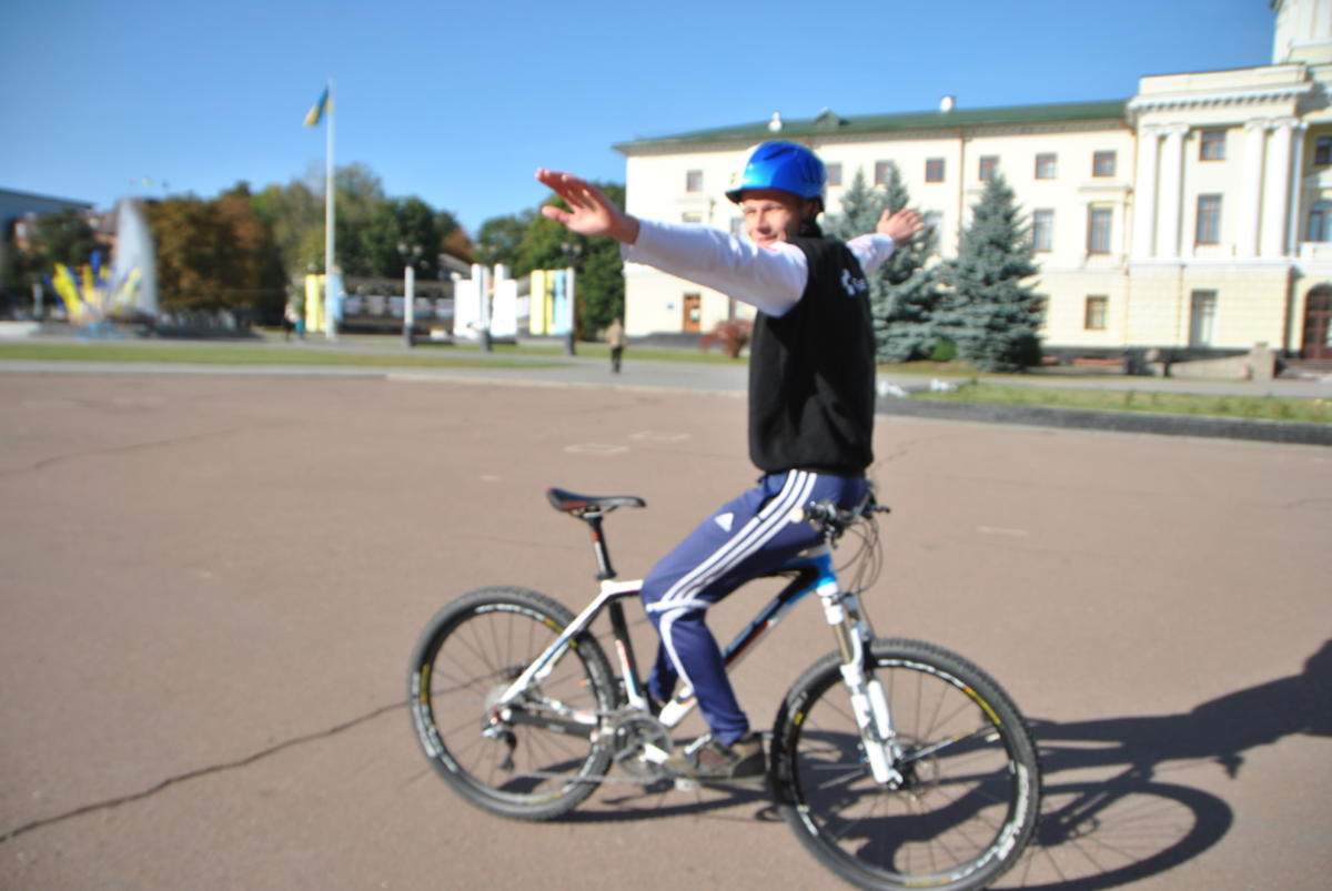 Почему 25-летний хмельничанин Олег Гришко, который занимается велоспортом с 12 лет, ездит спиной вперед, неизвестно. Возможно, потому, что в случае, если врежется в столб задом, а не лбом, будет не так больно. Хотя он уверен, что такая езда помогает развить третий глаз.