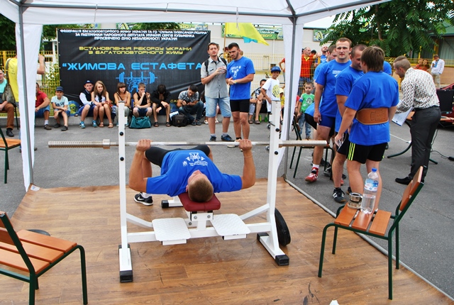 Собрались как-то в городе Александрия 15 сильных и крепких ребят из команды сборной Украины и устроили жимовую эстафету, суть которой заключается прежде всего в уважении к другим: отжал сам — дай отжать другу. Каждый из участников эстафеты имел лишь 5 минут на то, чтобы продемонстрировать свои железные мышцы и отжать штангу массой 55 кг максимальное количество раз.