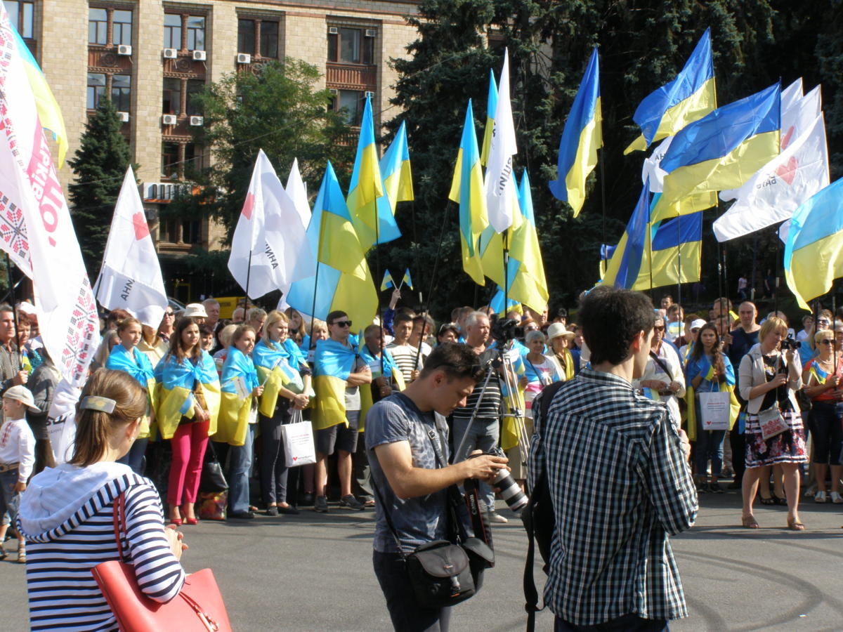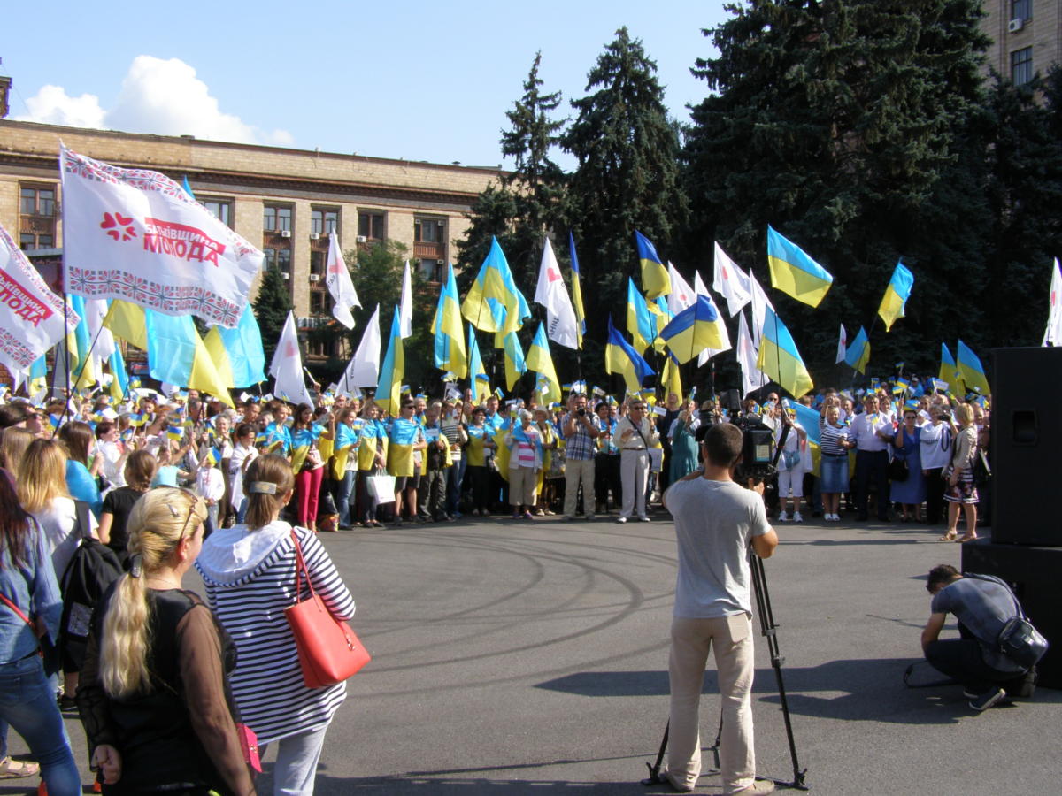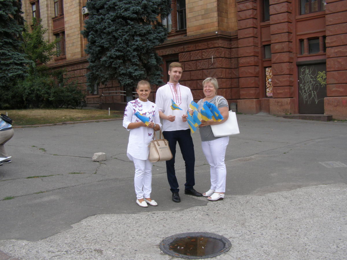 Дают — бери и празднуй! В День флага свое патриотическое шествие в центре Днепра представители «Батьківщини Молодої» подкрепили масштабной раздачей горожанам национальных флажков. За шесть с половиной часов прохожим были розданы 2017 флажков.