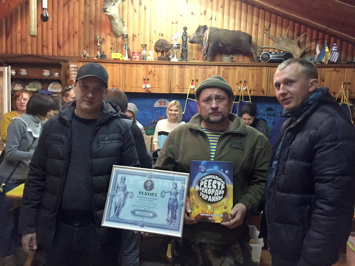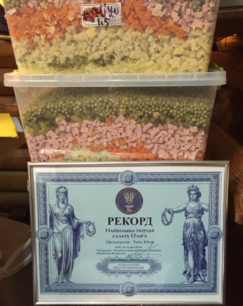 Волонтеры с удивительной скоростью измельчили 245 кг картофеля, 140кг моркови, 2100 шт. яиц, 35 кг лука, 70 кг огурцов, 175 кг колбасы и 80 кг майонеза. Кроме того, для салата потребовалось 350 банок горошка. Скорость транспортировки салата в зону АТО также может претендовать на рекорд.
