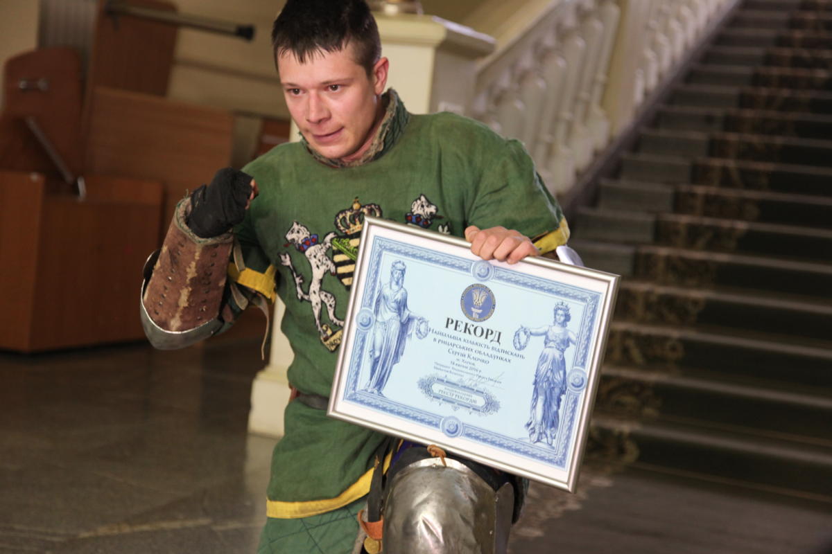 Харьковчанин Сергей Клочко, который занимается историческим фехтованием, взялся доказать обратное — на самом деле, латы позволяли удивительно свободно передвигаться. Сергей, который весит 57 килограммов, надел на себя 32-килограммовые доспехов и в них отжался 25 раз.