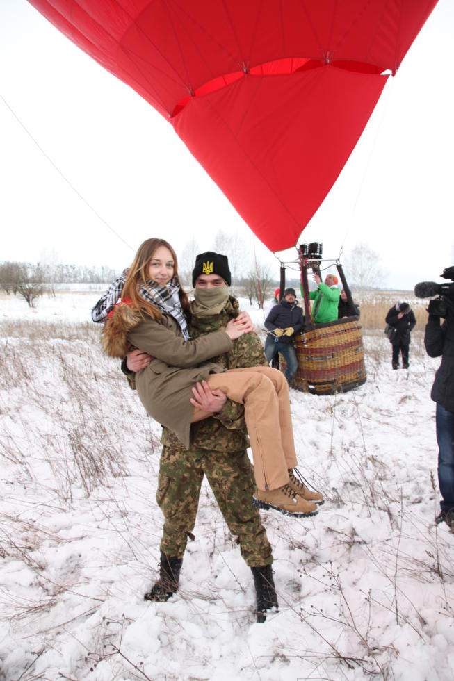 «На позицию девушка провожала бойца …» Провожать на позиции бойца АТО Хоббита киевская студентка Ирина решила так, чтобы об этом, может, и не составили бы песню, но запомнили надолго. Девушка подарила любимому на День святого Валентина полет для двоих на воздушном шаре в форме сердца. А эксперты позаботились, чтобы это прощание запомнилось не только романтикой, но и рекордом.