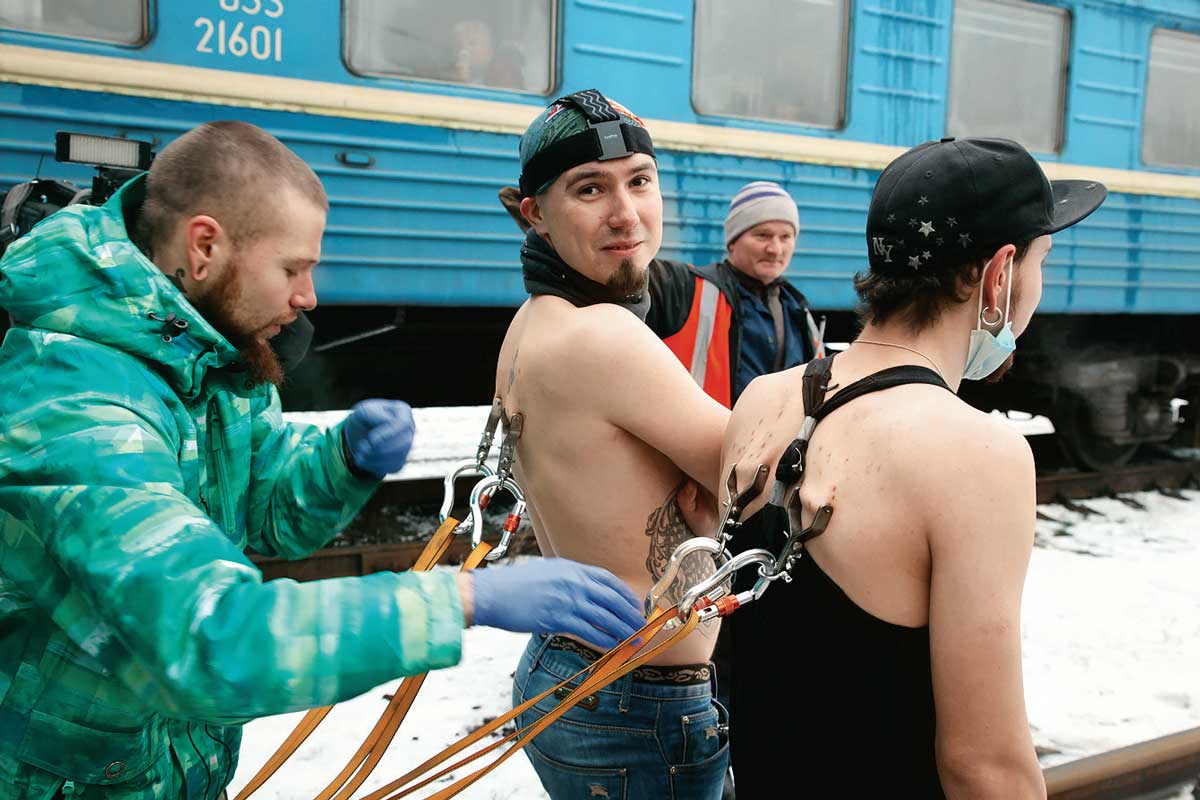 Чем только стонгмены не таскали вагоны! Киевляне Павел Клець и Андрей Панченко из команды Solar Suspensions мало до обморока ошеломили неподготовленных очевидцев установления рекорда Украины. Им обоим прокололи кожу спины и вставили в нее по два крюка, которые ремнями прицепили к вагону весом 26,7 тонны. Ребята невероятно напряглись, их кожа под крюками казалось сейчас разорвется — и вот вагон тронулся с места! Таким образом ребята протащили его на 5 метров 10 сантиметров!