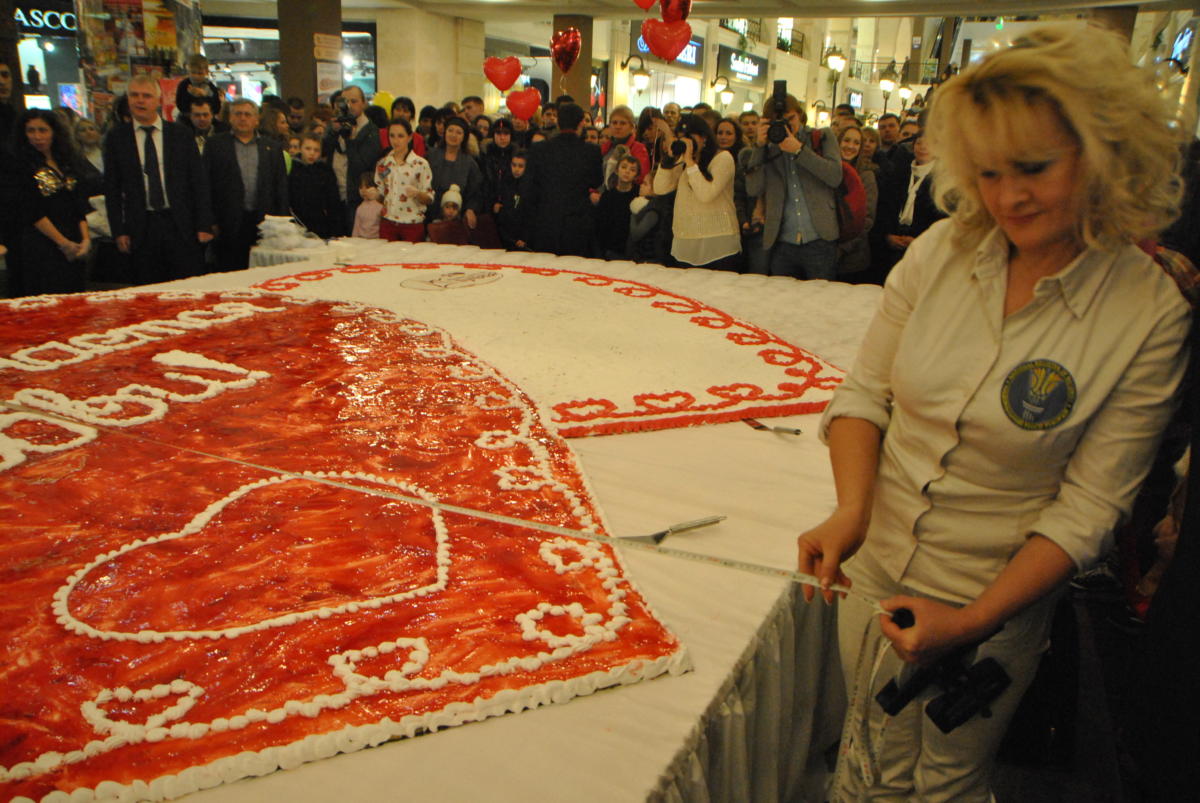 Каждый из них имел возможность почувствовать себя настоящим сердцеедом, ведь торт имел площадь 14,3 м.кв! — и вес более 240 кг. Несмотря на такие гигантские размеры, сладкое сердце исчезло бесследно за считанные минуты. Только и осталась в памяти присутствующих надпись на нем — вечный девиз «Все начинается с любви».