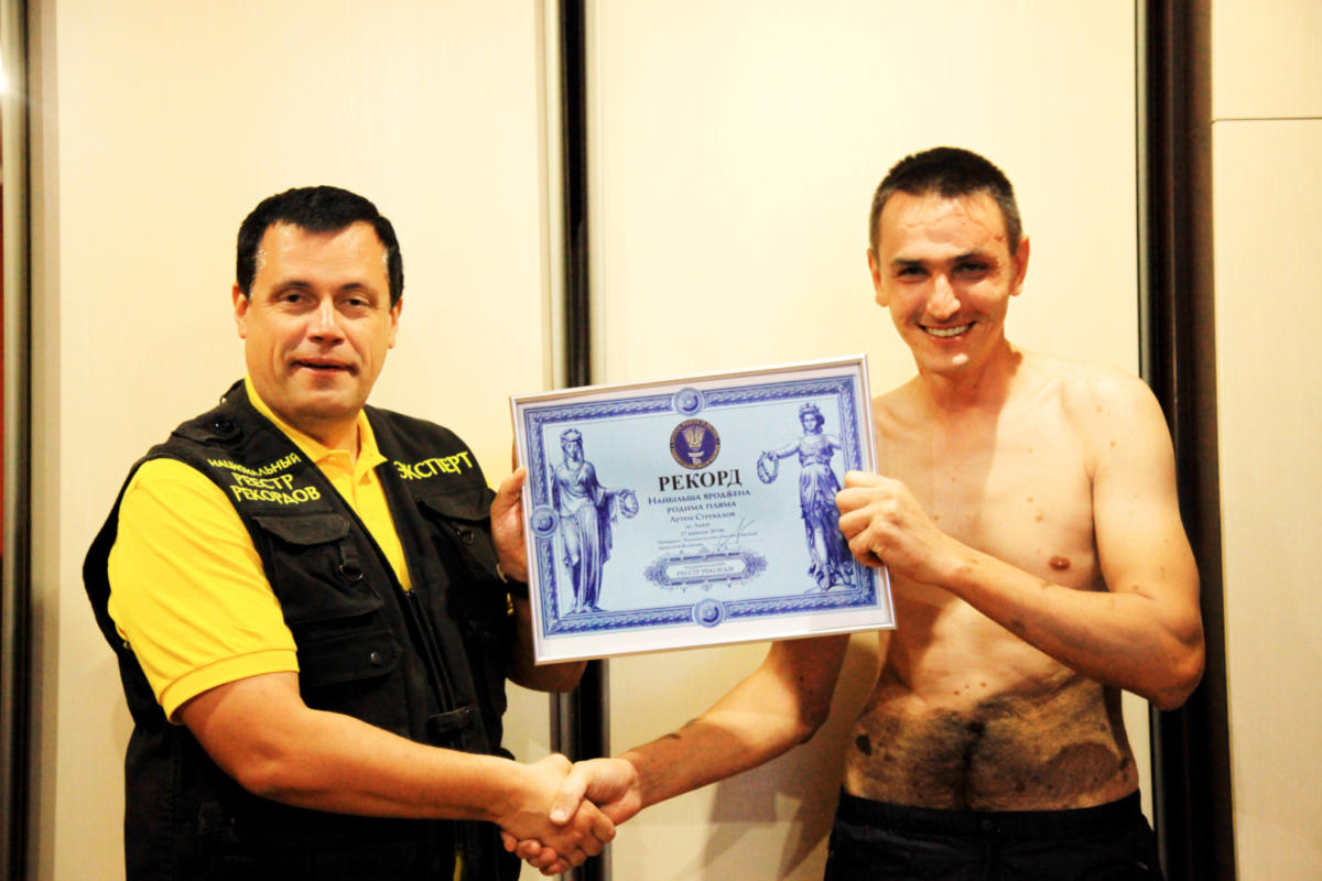 Наши предки считали, что родимое пятно — это «поцелуй от Бога», и неважно, на каком участке тела они располагаются. Если верить этому утверждению, то 35-летний львовянин Артем Стрикалов обцелованный богом весь. Запись в медицинской книжке, сделанная уже на 10-й день его жизни, свидетельствует о его обширном врожденном невусе (родимое пятно по-медицински). Фактически родимое пятно занимает треть его тела!
