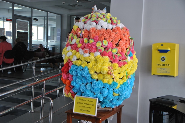 Более масштабно подошли к этому делу работники территориального центра социального обслуживания города Винница. Вместе со своими подопечными они изготовили к Пасхе писанку, сплетенную из ивовых ветвей и украшенную 2094 цветками из цветных бумажных салфеток. Цветов на самом деле должно было быть больше, но, очевидно, что несколько салфеток кто-то использовал по назначению.