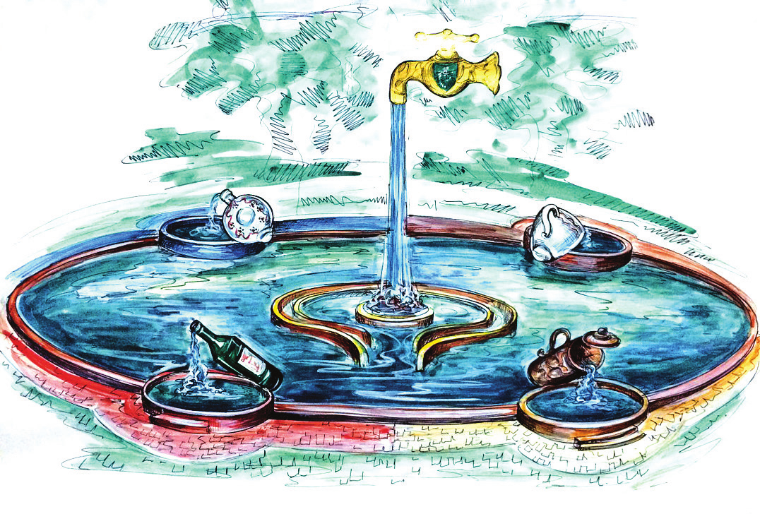 Общая площадь чаши фонтана-бассейна составляет впечатляющие 1267 м2. Фонтан имеет вид левитуючого на высоте 11 м водопроводного крана длиной 9,3 м, с которого течет струя воды, диаметром 1 м. К основному круглому бассейну диаметром 40 м, примыкают четыре бассейна-джакузи с фонтанами в виде: винной бутылки, куманца с палинкой , пивной кружки и кофейной чашки гигантских размеров.