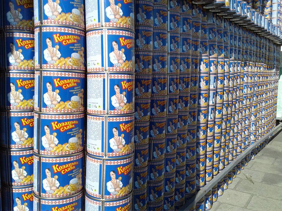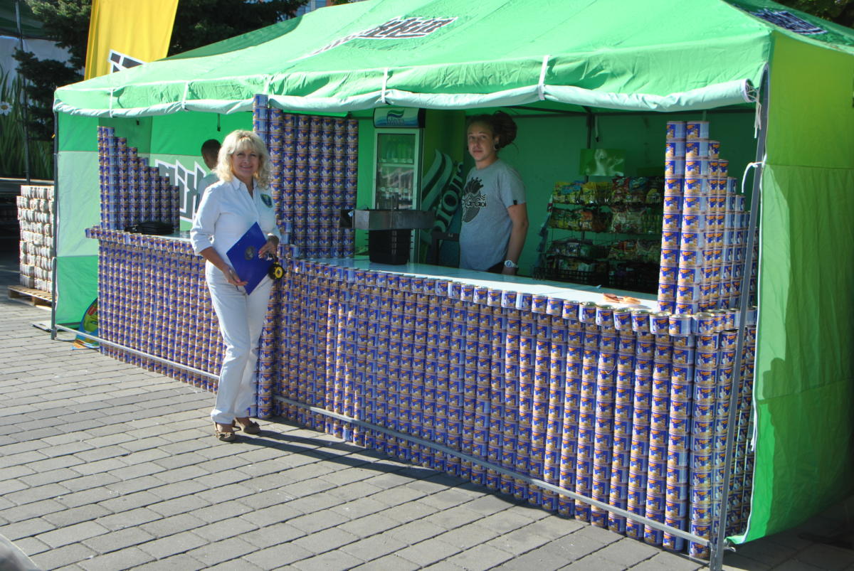 Главное не то, что внутри банок — арахис, а, собственно, рекорд. Эксперты насчитали 4567 банок весом 120 граммов, из которых при поддержке организаторов рекорда — Ассоциации рестораторов и отельеров Днепропетровской области — было выстроено крупнейшую в Украине барную стойку.