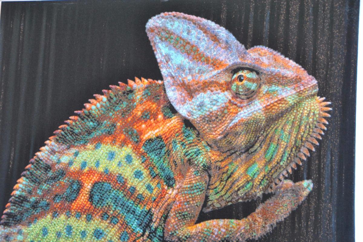 Всем тем, кто был на выставке «Украинская неделя искусств» и вживую видел рекордную работу мастерицы Татьяны Романенко, могло показаться, что у них оптический обман зрения. Мерещилось, что сплетенный ею из бисера хамелеон, на картине размером в человеческий рост, водит глазом за посетителями!