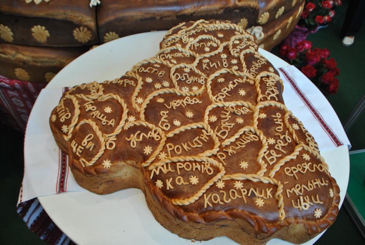 Мастера производственного цеха №1 ПАО «Киевхлеб» испекли каравай окружностью 8 метров 8 сантиметров, весом 500 килограммов и высотой 1 метр 80 сантиметров. То есть это произведение кулинарного искусства весил, как шесть среднестатистических украинский и в среднем на 5 сантиметров превышал рост каждого из них.